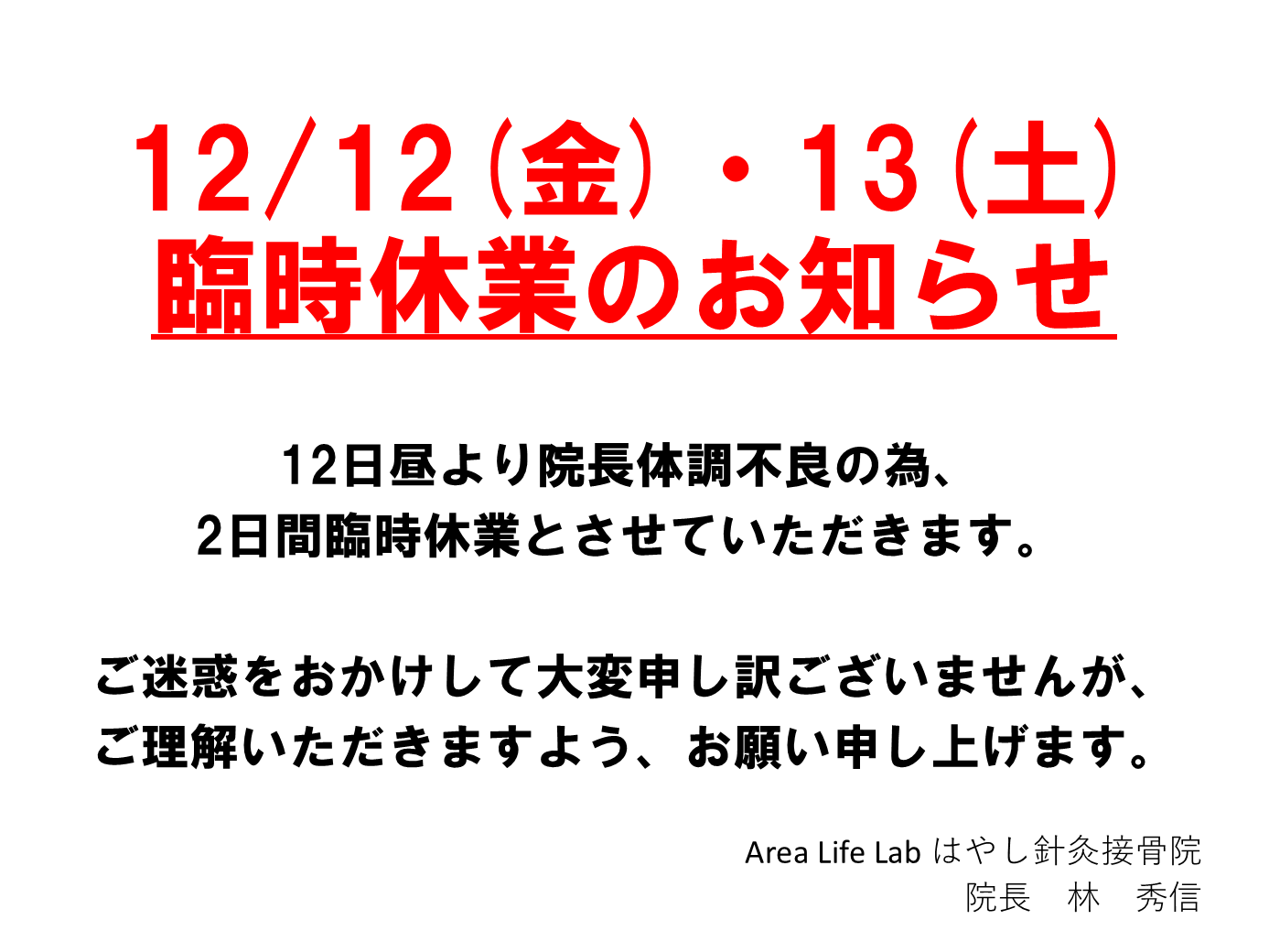 臨時休業 2025.12.12 12日昼に院長が発熱をいたしました。 感染拡大防止の為、12日午後の部、13日をお休みとさせていただきます。 再開日は追って報告いたします。 ご迷惑をおかけいたしますが、何卒宜しくお願い致します。