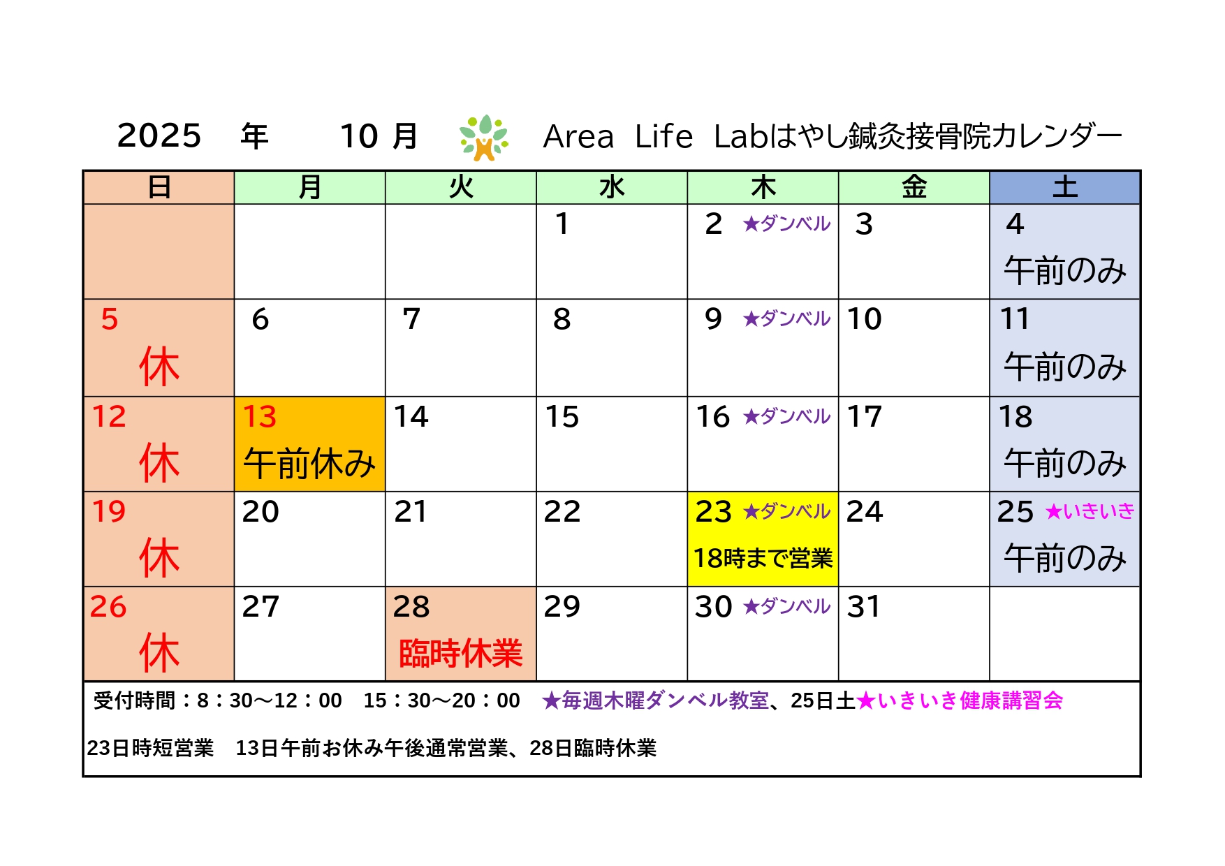 10月営業カレンダー 2025.09.29 こんにちは はやし針灸接骨院 院長の林です 10月大分涼しくなり、過ごしやすい気候になってまいりました。 皆様体調はいかがでしょうか? 乾燥や寒暖差などで体調崩されないよう、お気を付けください。 10月営業カレンダーが出来上がりました。 13日施設へ体操教室に伺うので午前休業です。午後は通常通り営業いたします。 23日18時までの受付です。 28日臨時休業させていただきます。 時間変更あり、ご迷惑おかけいたしますが、 何卒よろしくお願いいたします。