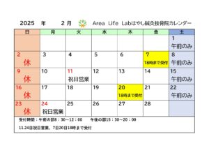 2月営業カレンダー 2025.01.20 こんにちは Area Life Labはやし針灸接骨院 院長 林です 2月営業日カレンダーを作成いたしました。 2月11日、24日は祝日営業いたします。 2月7日、20日は18時までの受付とさせていただきます。 時間変更がありご迷惑おかけしますが、宜しくお願いいたします。