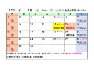 3月営業カレンダー 2026.02.25 こんにちは Area Life Lab はやし針灸接骨院 院長の林です 寒暖差が激しく、体の調子が整いずらい時期ですが、 皆様いかがお過ごしでしょうか? Area Life Lab はやし針灸接骨院 3月営業カレンダーができました! ※営業時間変更※ 3月12日(木)午後18時までの受付 3月13日(金)臨時営業 3月20日(金祝)祝日営業 今月もどうぞよろしくお願いします。